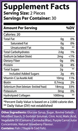 These delicious gummies combine hydrolyzed collagen and Vitamin C to: